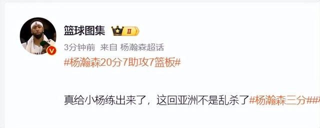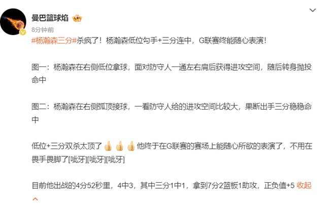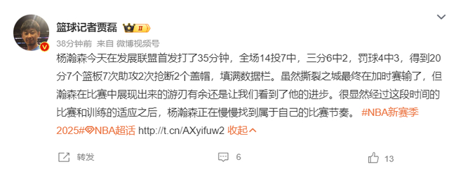杨瀚森在G联赛又打出一场完善的球,全场角逐20+7+7,他直接登上了国内的热搜榜,作为现役中国男篮独一一个在NBA打球的球员,中国球迷们都很存眷他的表示。