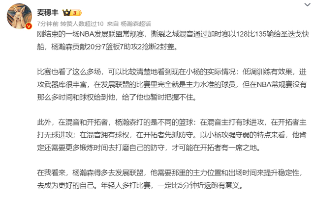 麦穗丰:杨瀚森在开辟者与混音是打分歧篮球,战术地位完全分歧,混音有能持球进攻,开辟者只能打无球,杨瀚森有球权才能闪现本身的才调,他原本就是攻强守弱的特点,他需要更多时候去打磨戍守,杨瀚森就该多去G联赛打球,在那边有主力地位、不变登场时候,比在NBA折返跑成心义。